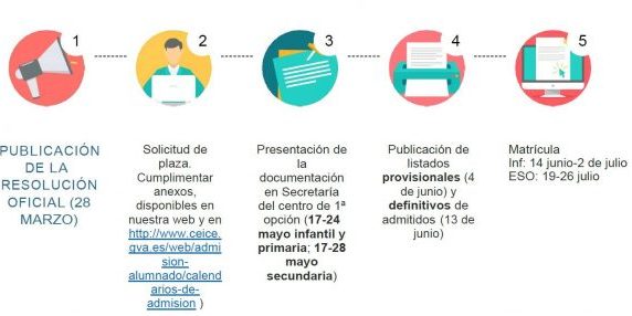 Tras la información que os facilitamos en la Jornada de Puertas Abiertas sobre la publicación en el DOCV de 28 de marzo sobre la Resolución por la que se establecen el calendario y el procedimiento de admisión del alumnado a las enseñanzas de Educación Infantil, Primaria y Secundaria. Os informamos más detalladamente de toda la documentación que se necesita, así como el calendario.