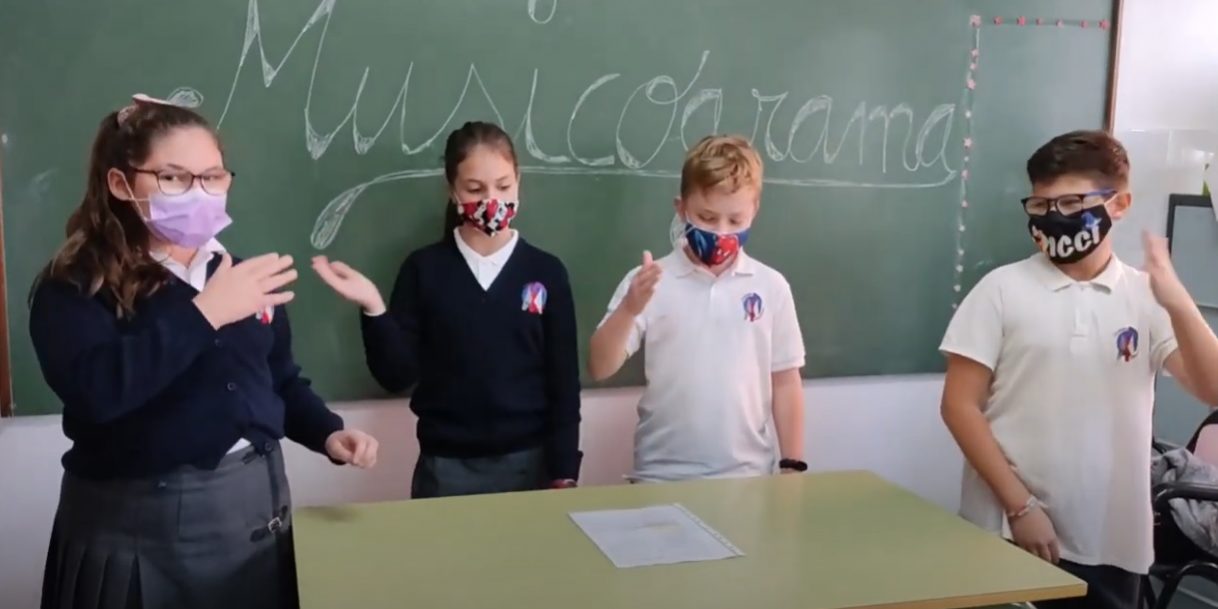 Los alumnos de 5º y 6º de primaria han realizado un proyecto que engloba las dos áreas de Educación Artística, la música y la plástica, y han creado y llevado a la práctica un MUSICOGRAMA, es decir, han elegido una canción y han trabajado el ritmo y la melodía creando sus propios dibujos para cada parte de la canción, que se correspondían con sonidos que debían hacer con su propio cuerpo, como palmadas, patadas, golpes en la mesa, etc. Los tiempos COVID invitan a reinventarse, y ellos lo han entendido mejor que nadie.