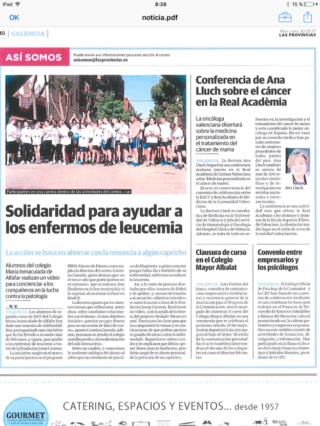 DetallesHoy nuestro colegio sale en la Prensa, concretamente en las Provincias, con la noticia «Solidaridad para ayudar a los enfermos de leucemia». El proyecto #ValoresdeFuturoBBVA está dando sus frutos gracias…