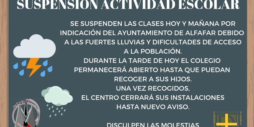 A instancia del Ayuntamiento de Alfafar, las clases quedan suspendidas por la dificultad en los accesos. Por lo tanto, no habrá clase ni la tarde de hoy jueves, ni durante todo el día de mañana viernes.